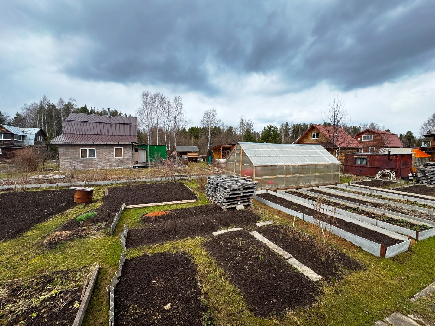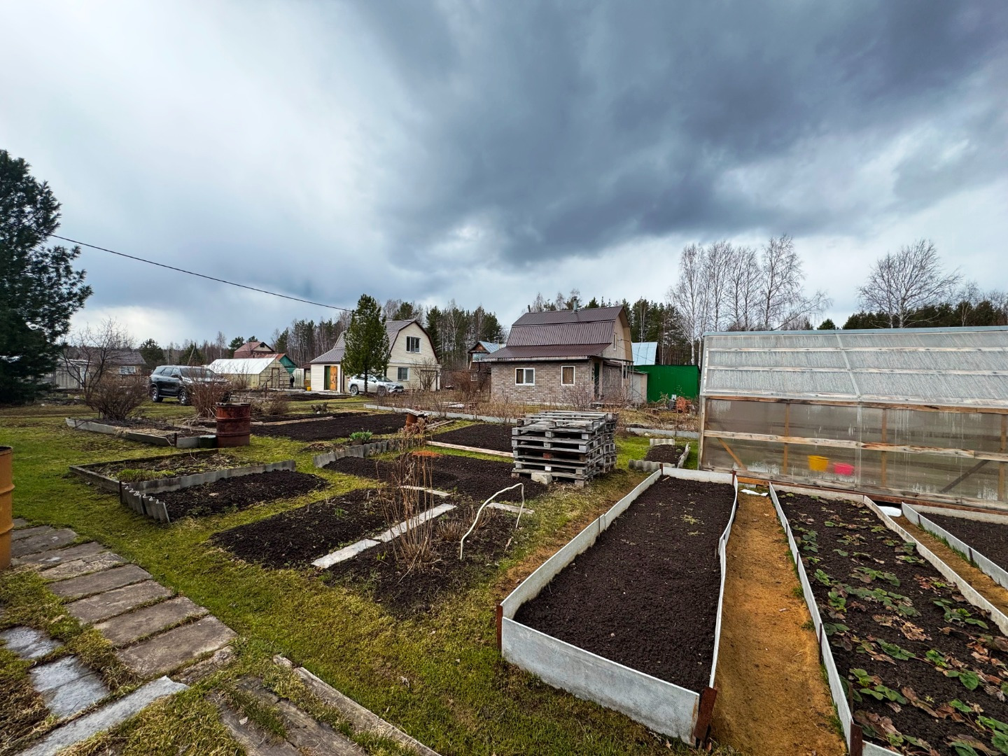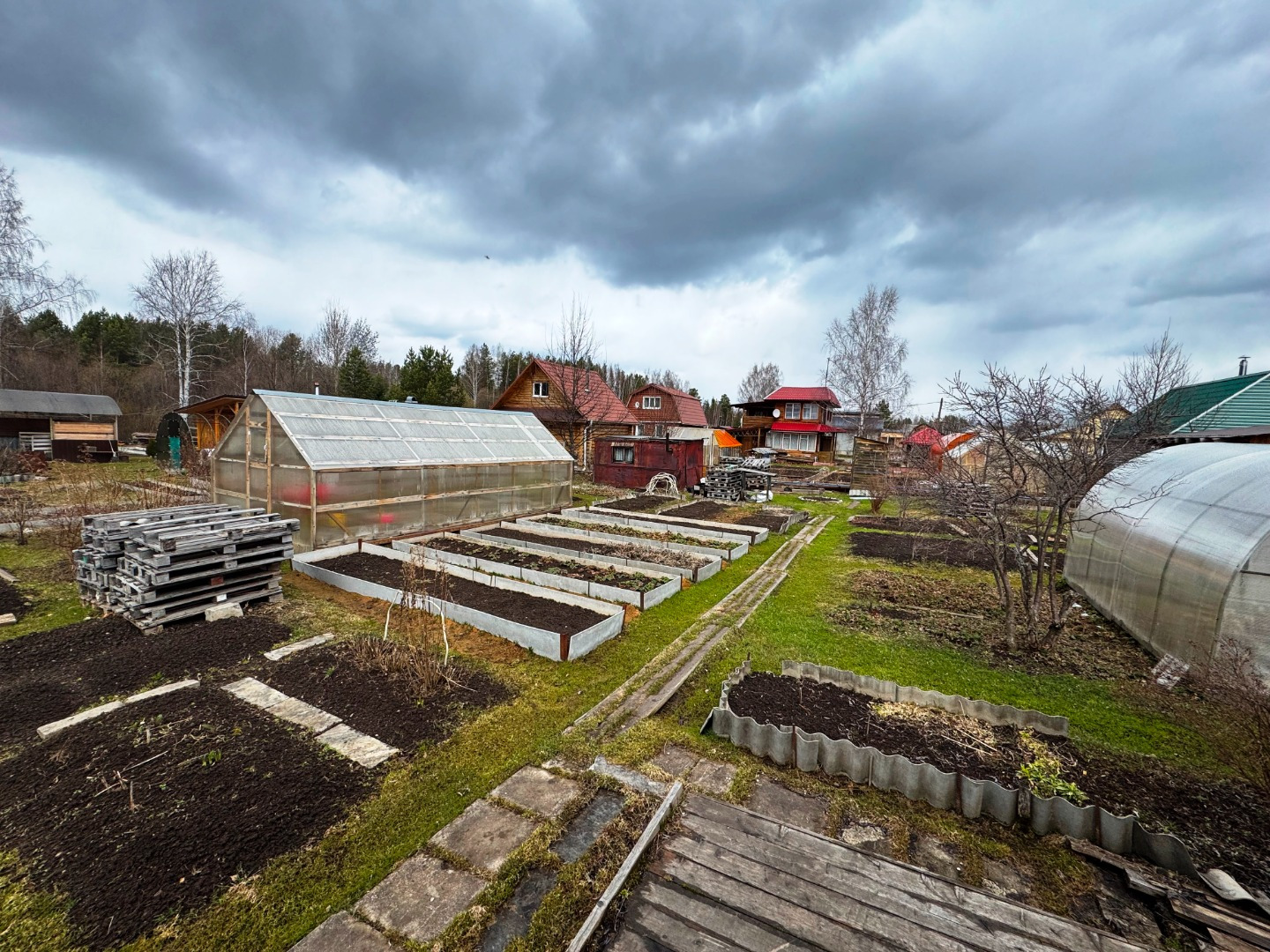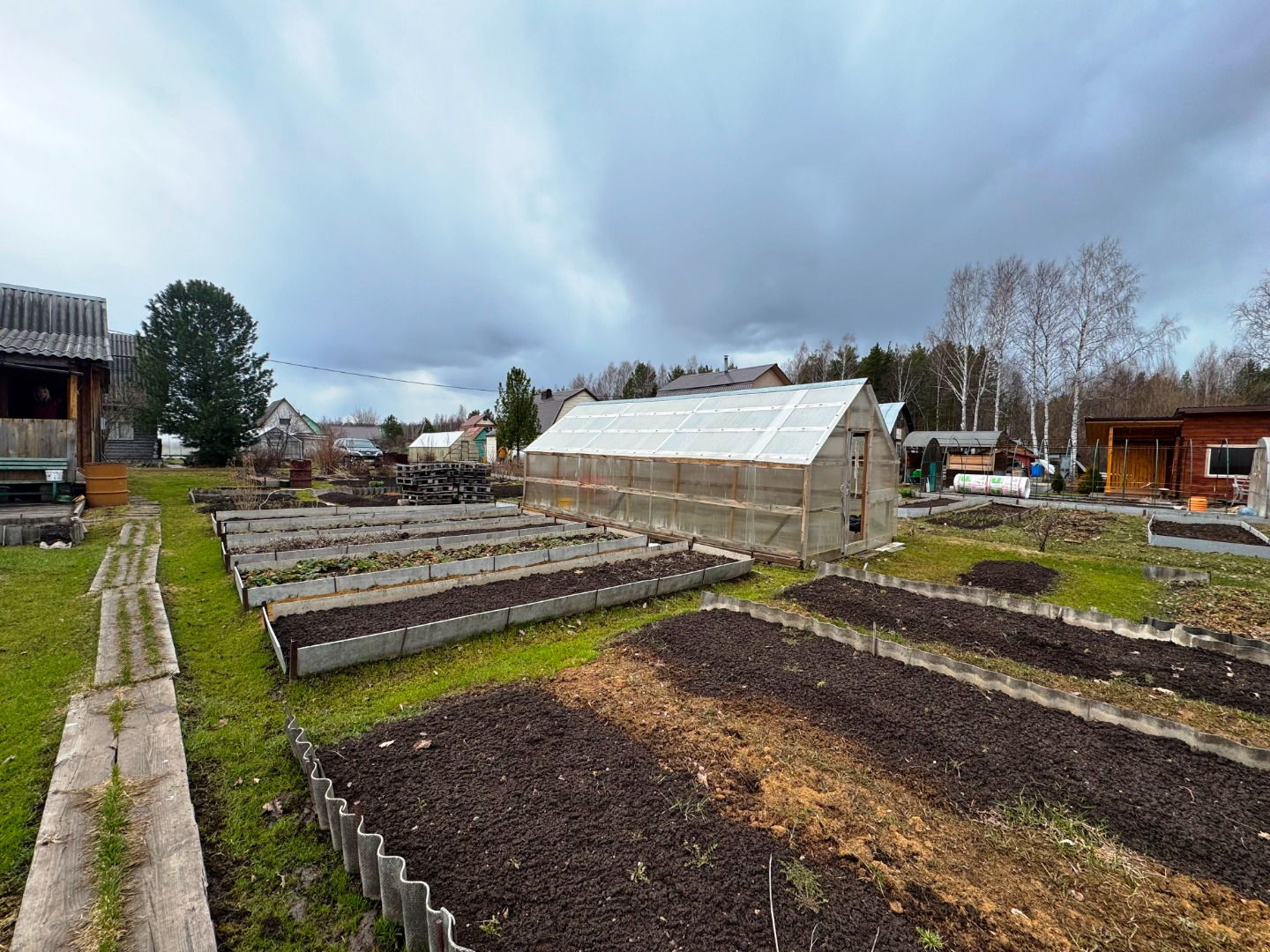 Участок по периметру не огорожен забором, но при желании можно огородить. Имеется две теплицы.