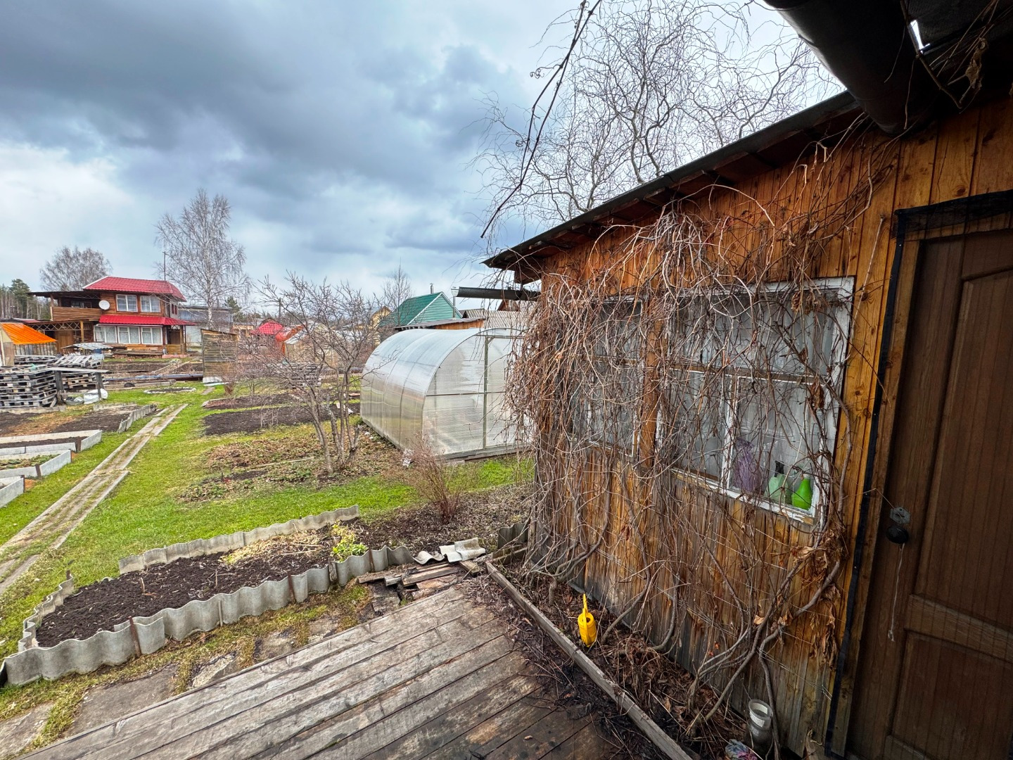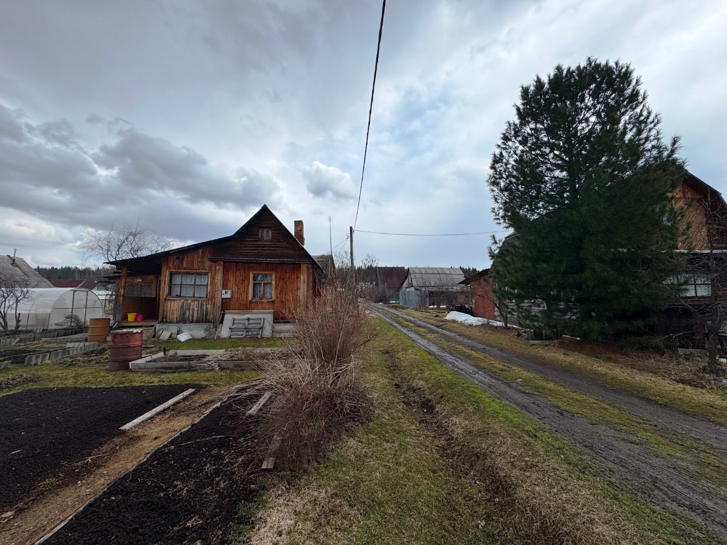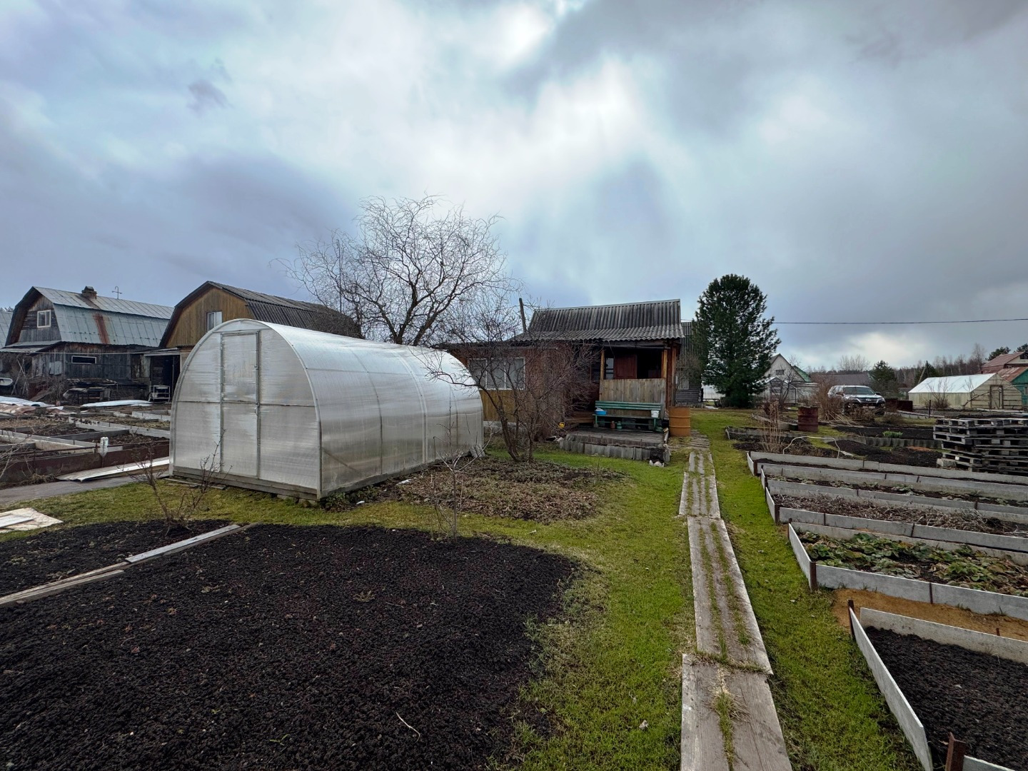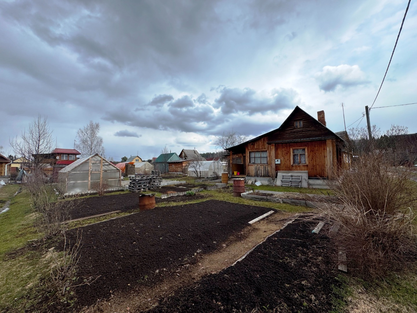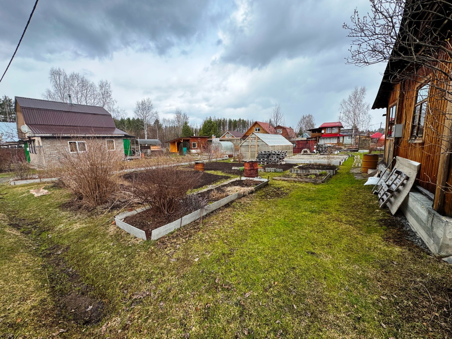 Участок по периметру не огорожен забором, но при желании можно огородить. Имеется две теплицы.