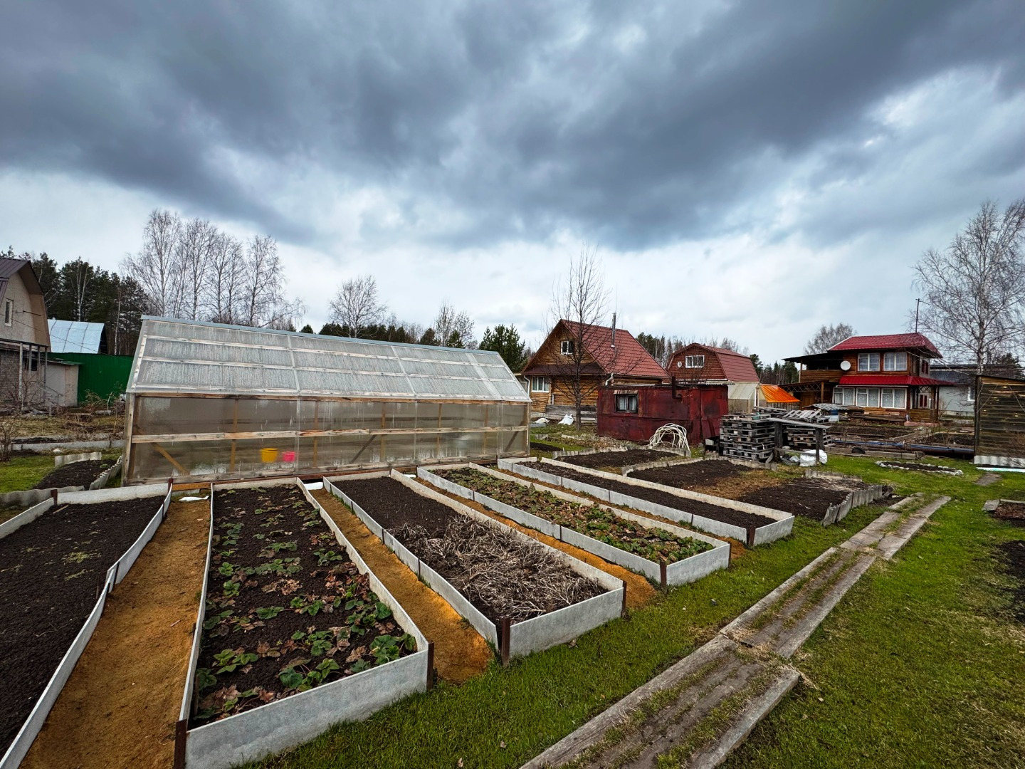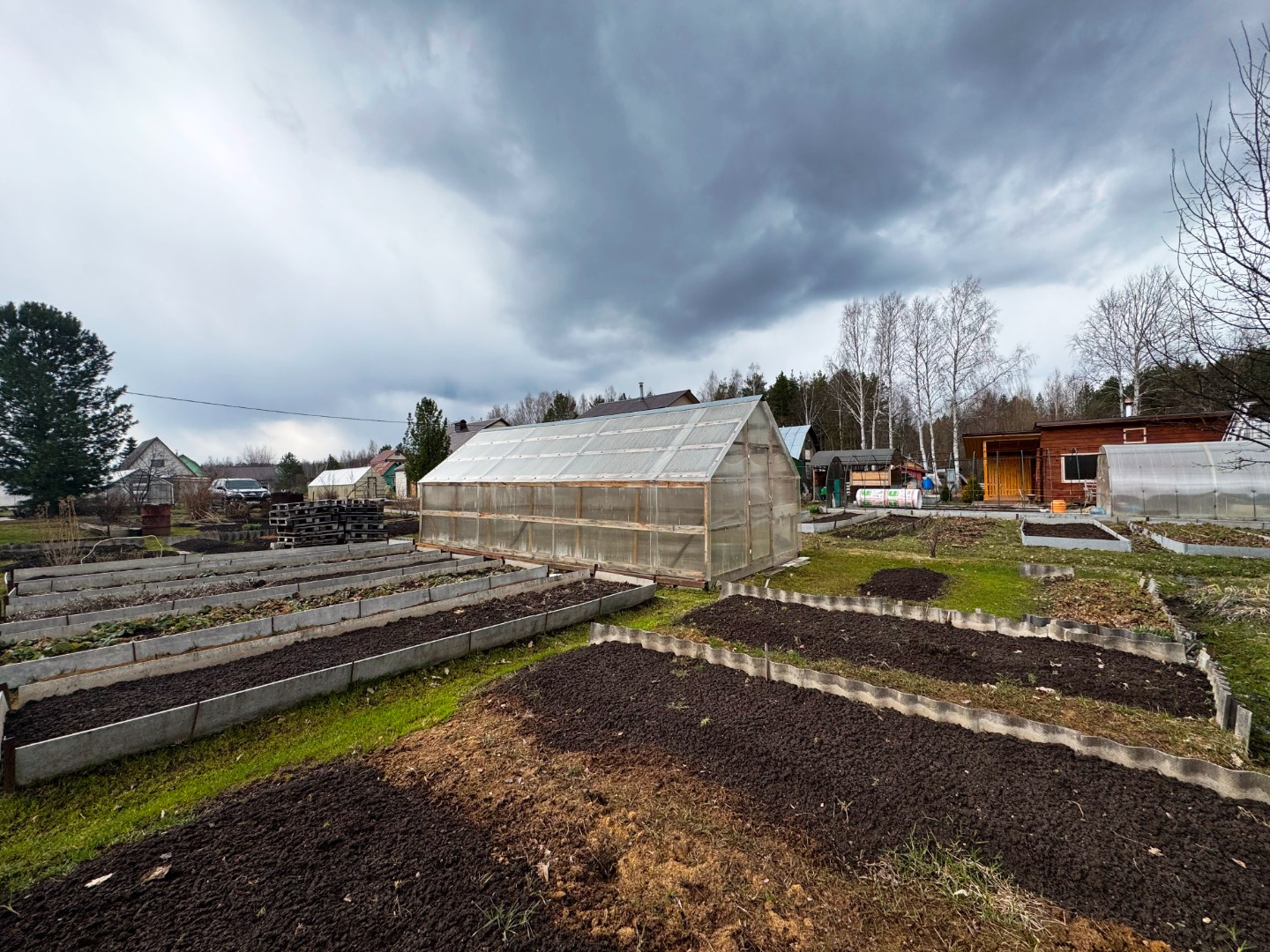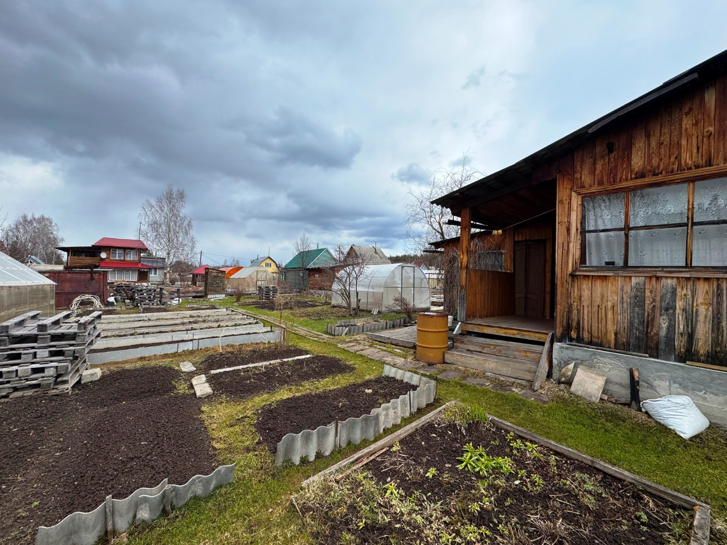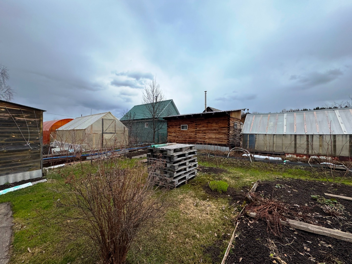 Участок по периметру не огорожен забором, но при желании можно огородить. Имеется две теплицы.