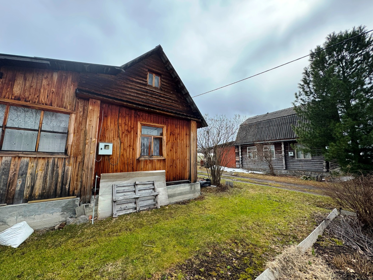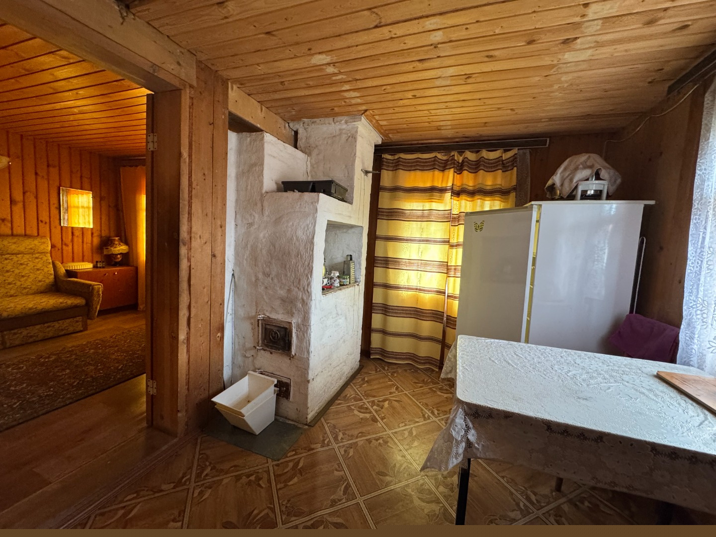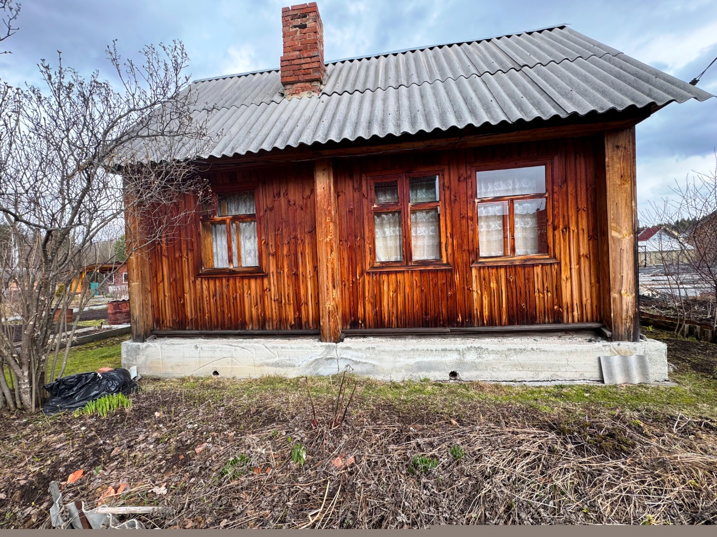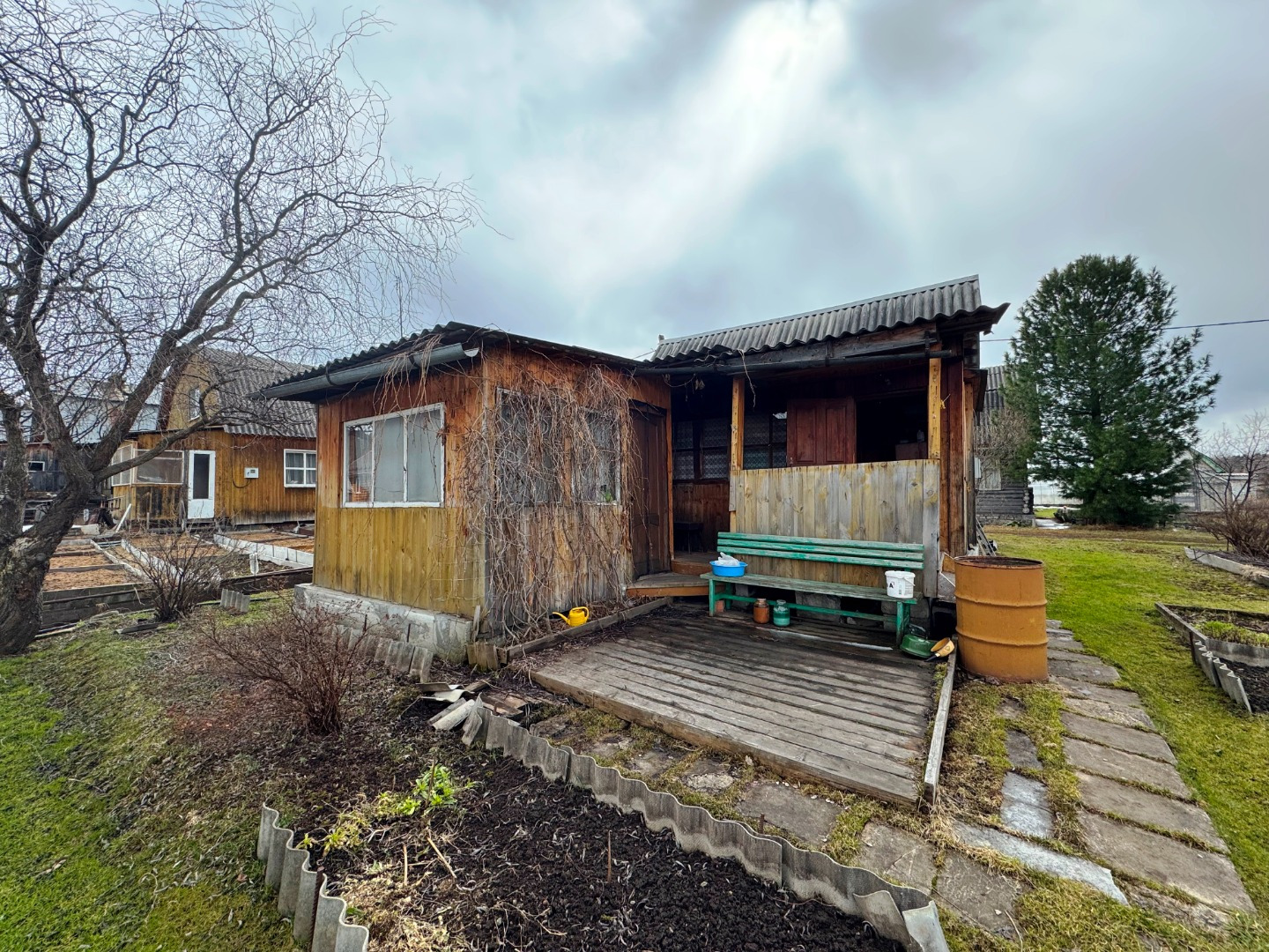 На участке площадью 6.6 сотки расположен дом с верандой, построен из бруса, дом утеплен и обшит. Отопление печь.